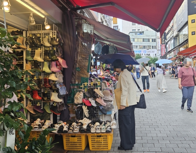 오전 서울 중구 남대문시장에 한 시민이 레인부츠와 샌들을 구경하고 있다./사진=박상혁 기자.